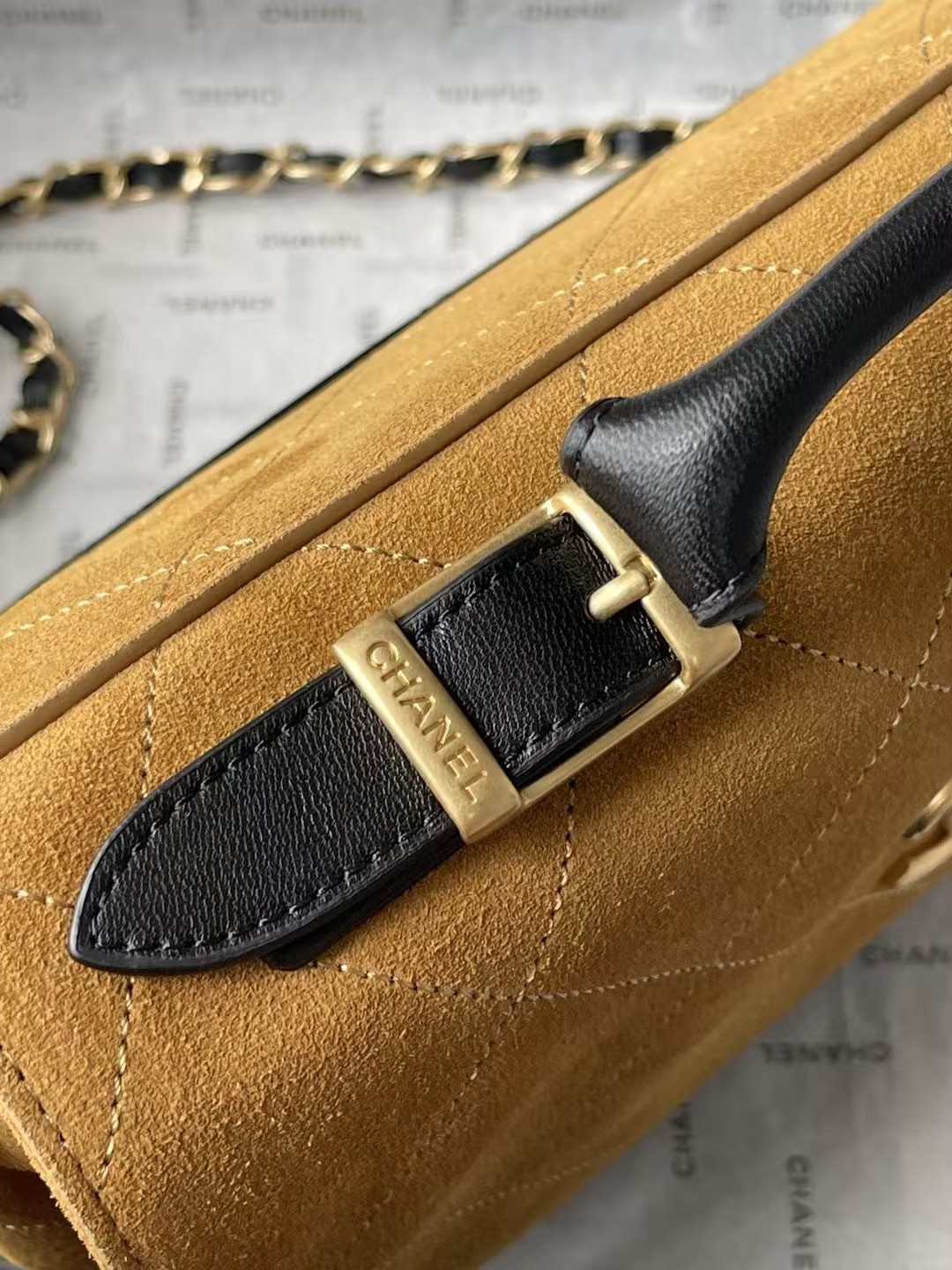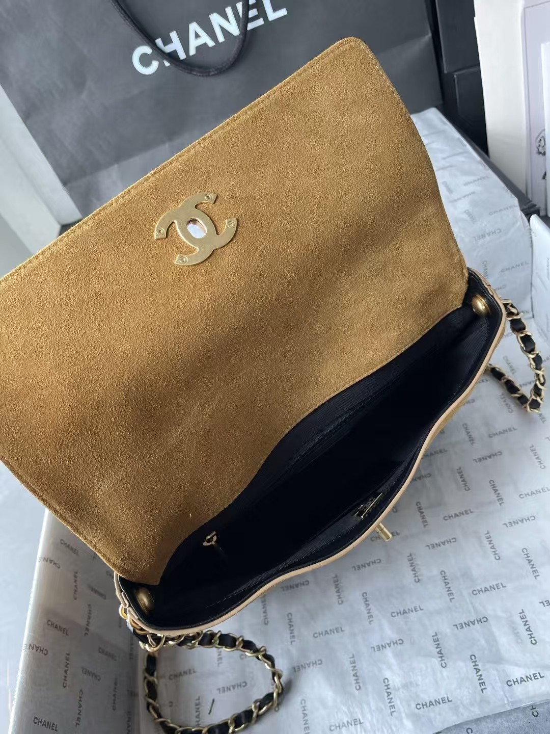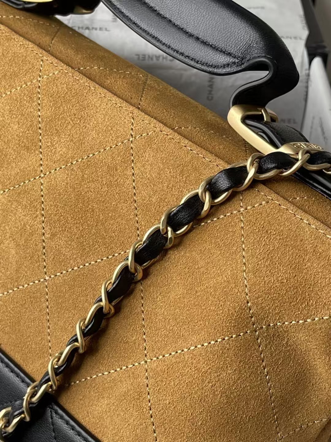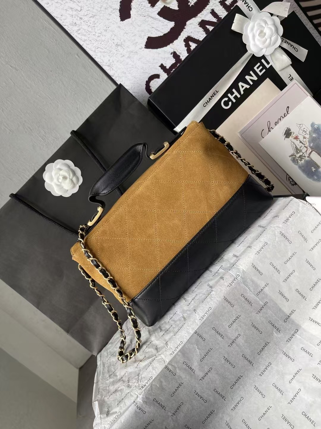 Chanel Coco Base Top Handle Flap Bag Brown Suede and Black Shiny Lambskin Brushed Gold Hardware