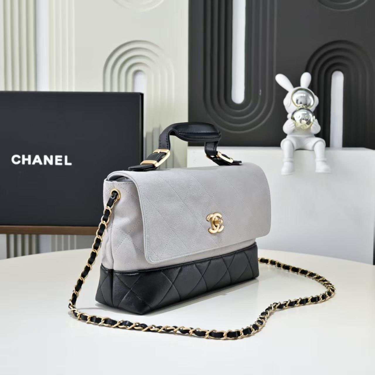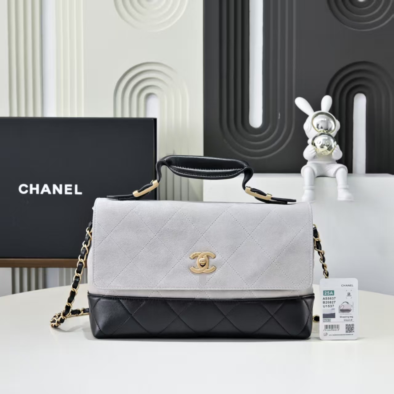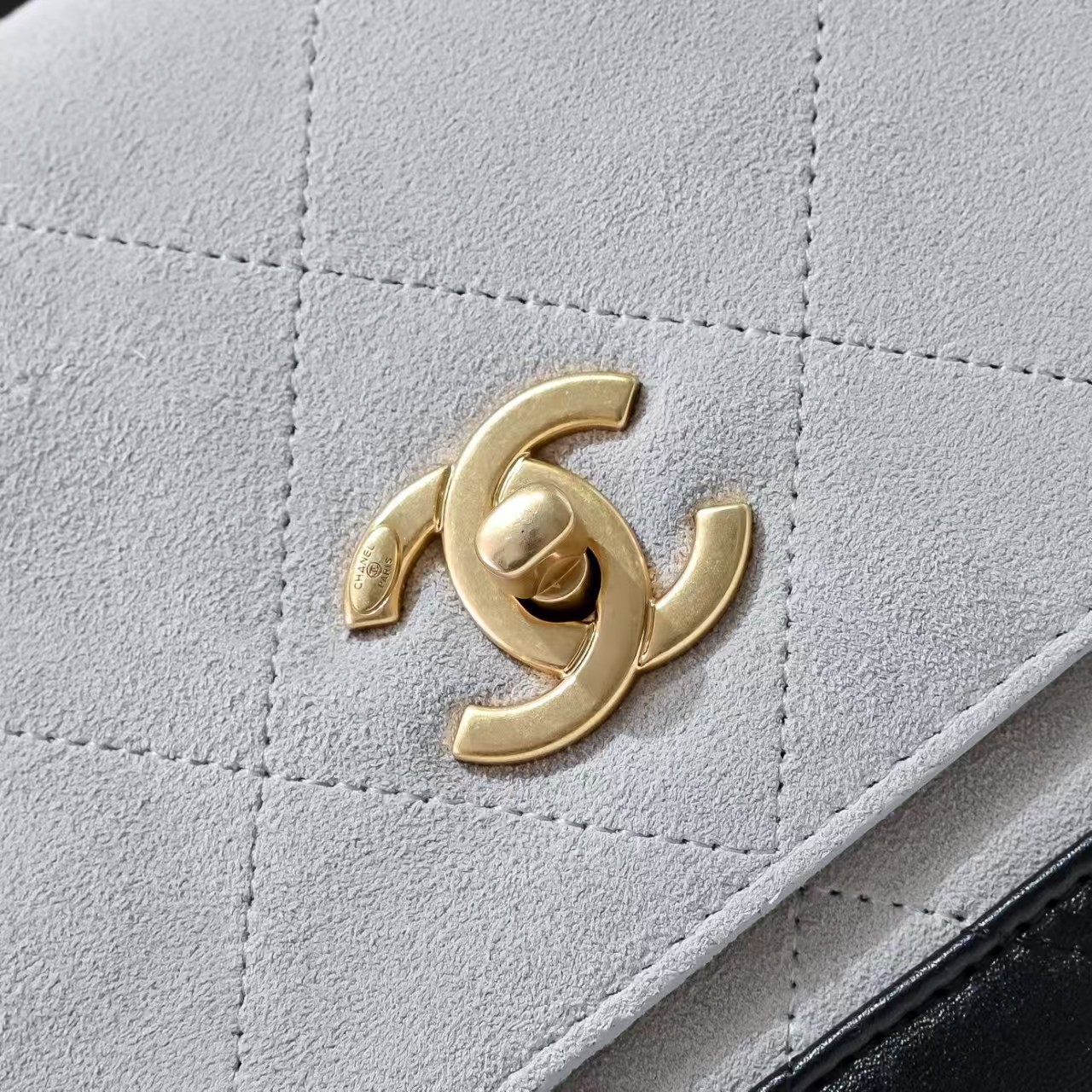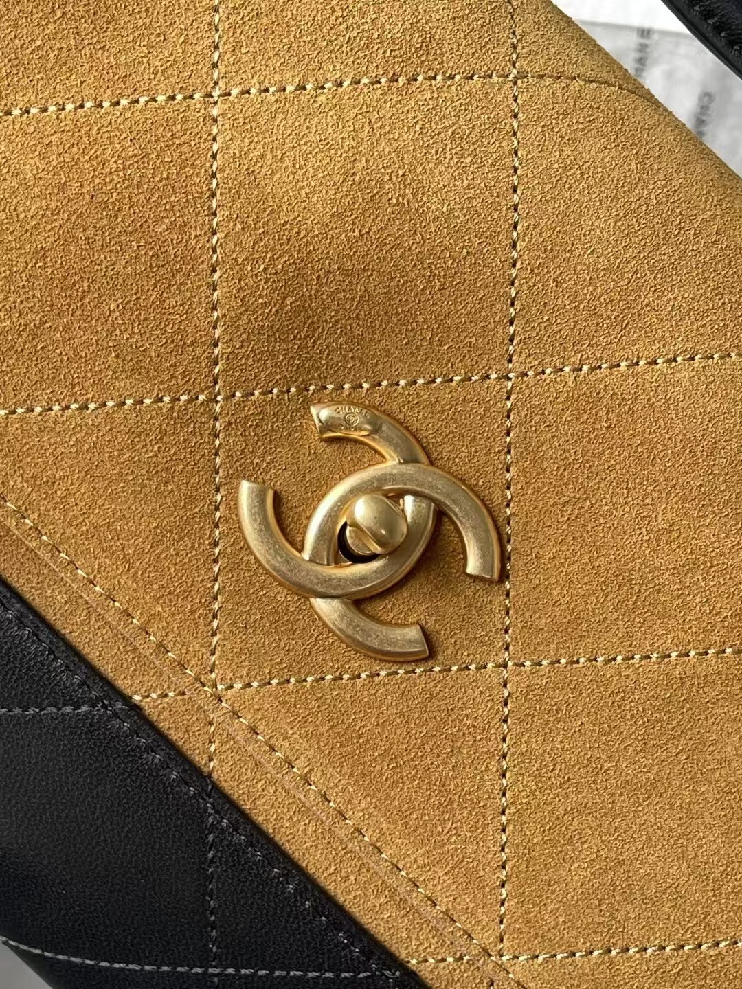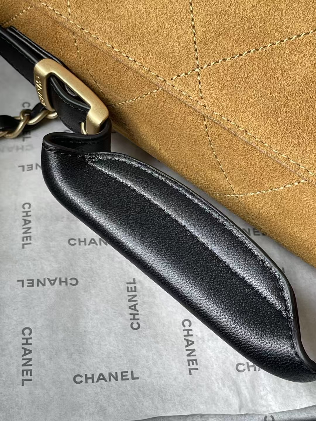 Chanel Coco Base Top Handle Flap Bag Brown Suede and Black Shiny Lambskin Brushed Gold Hardware