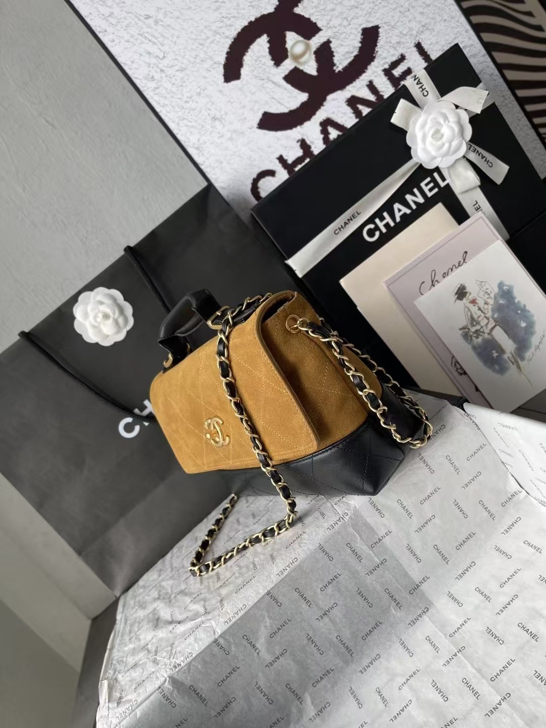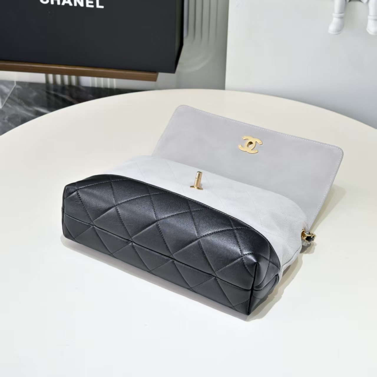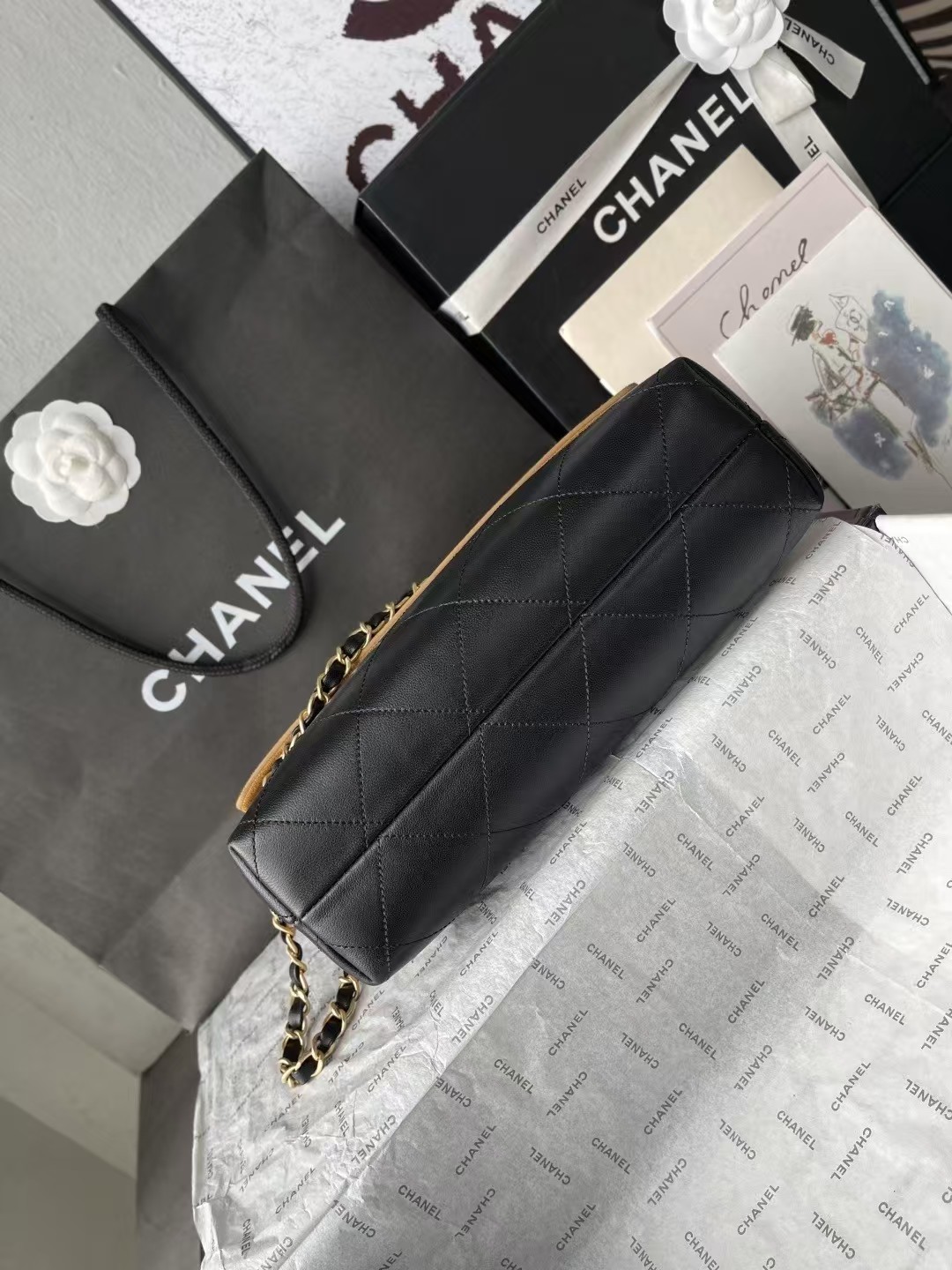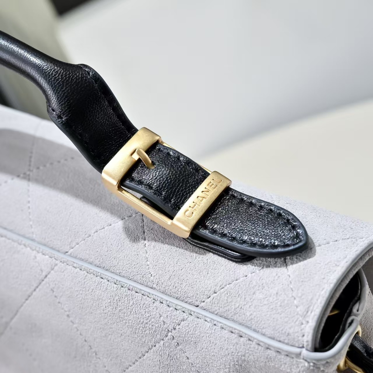 Chanel Coco Base Top Handle Flap Bag Brown Suede and Black Shiny Lambskin Brushed Gold Hardware