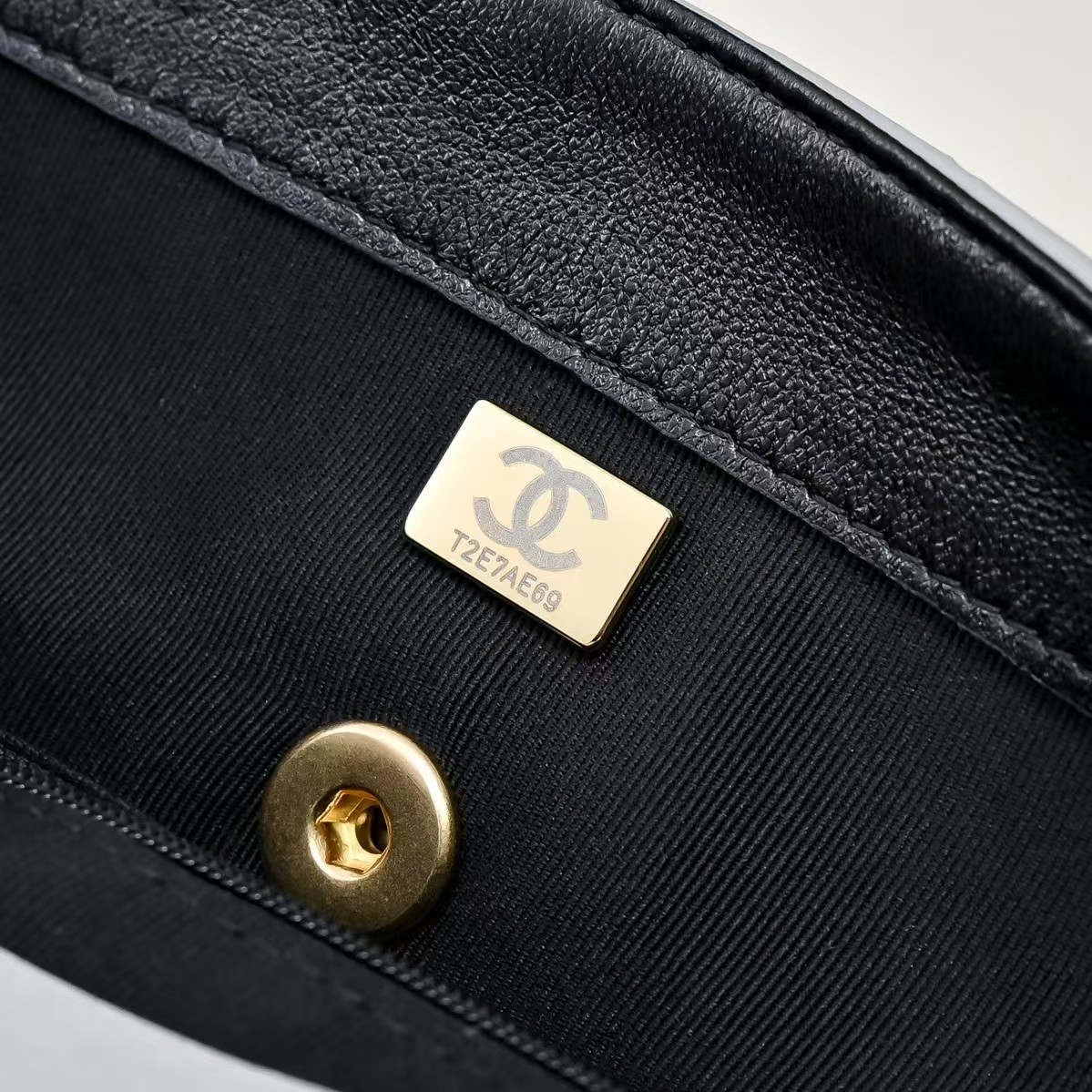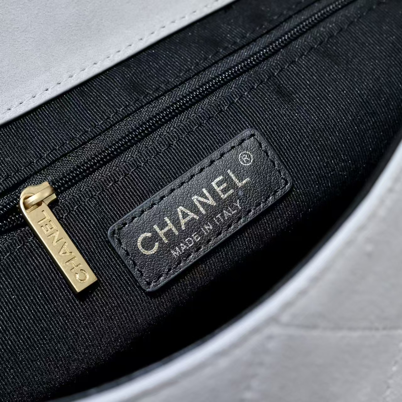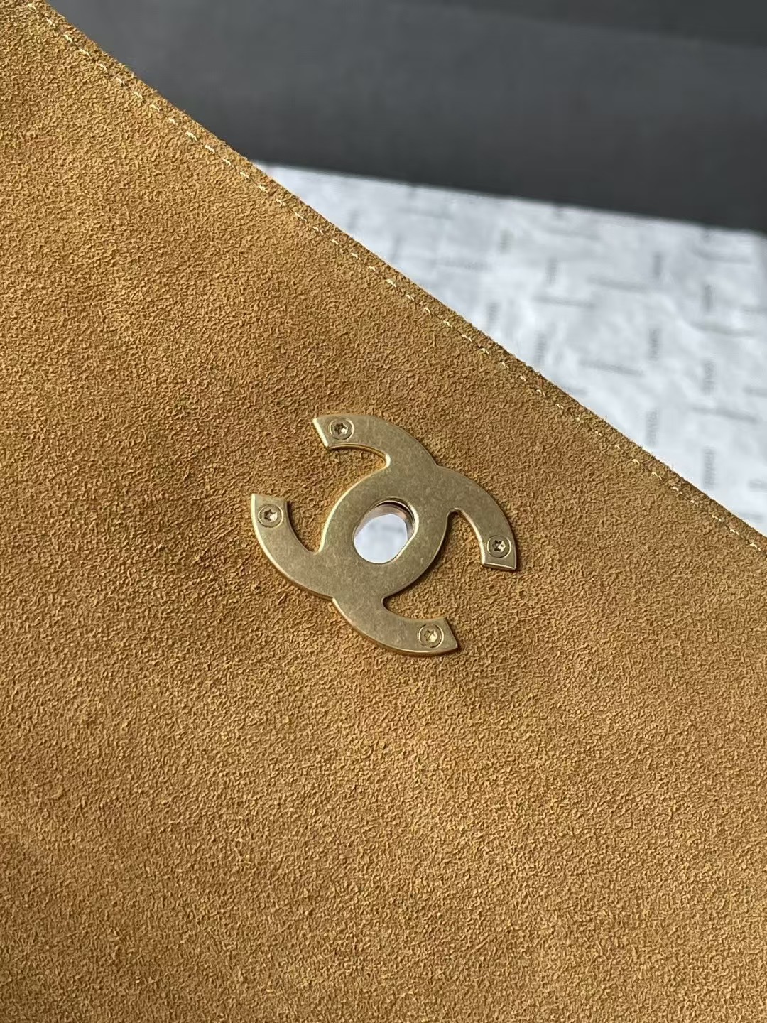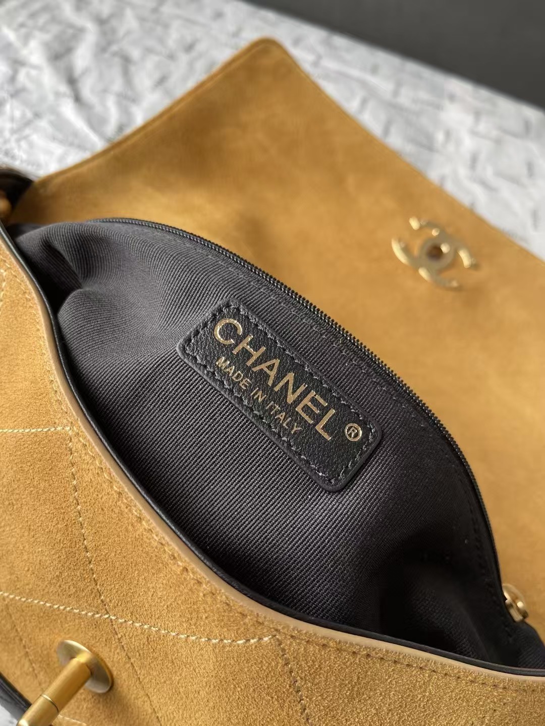 The interior is lined in black grossgrain fabric and brown suede calfskin leather and has one zipper pocket with Chanel pull on the rear wall and a slit pocket on the front wall.
