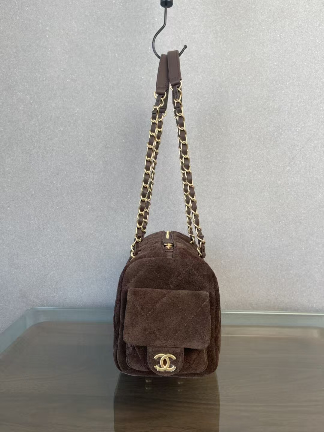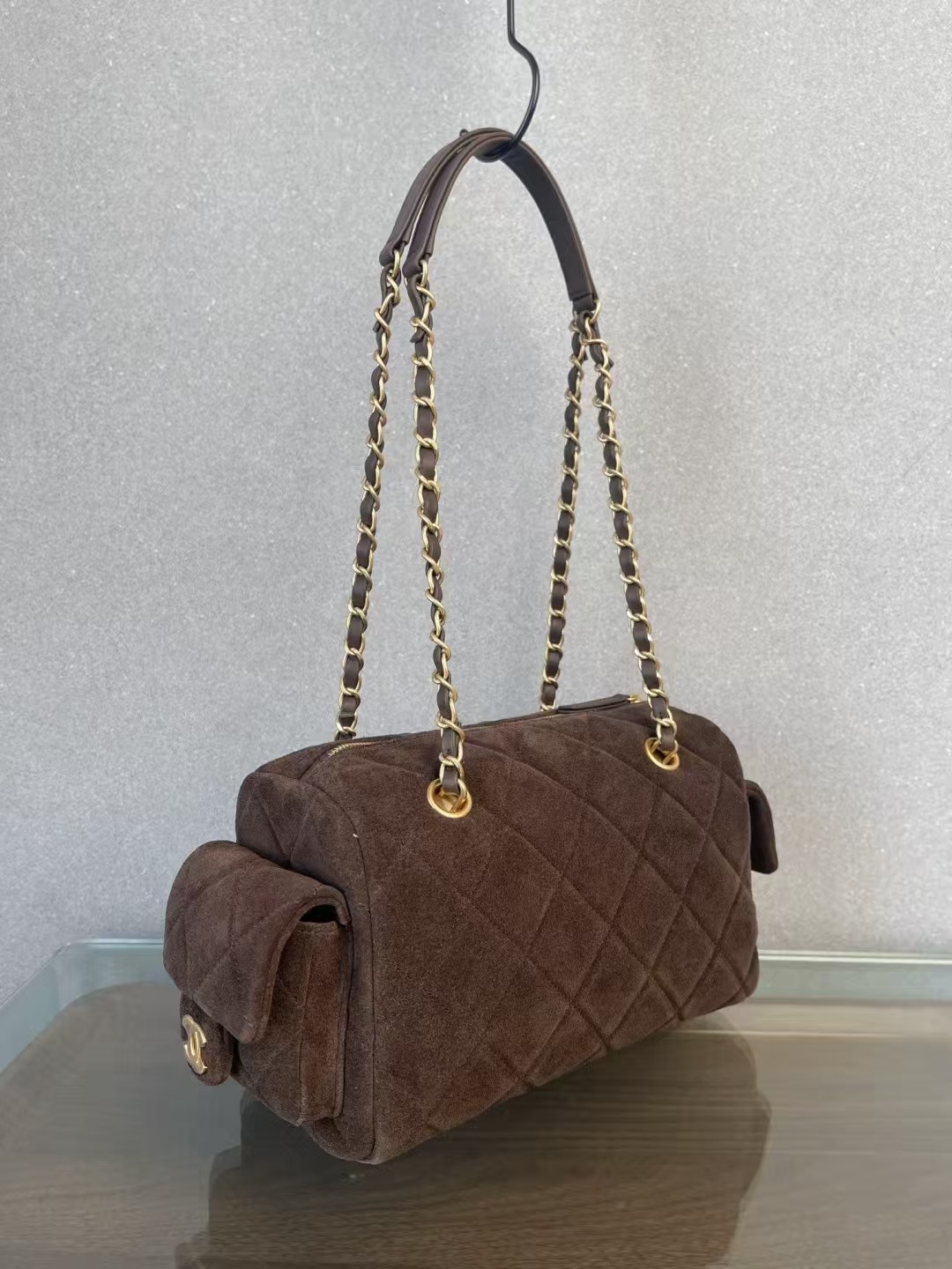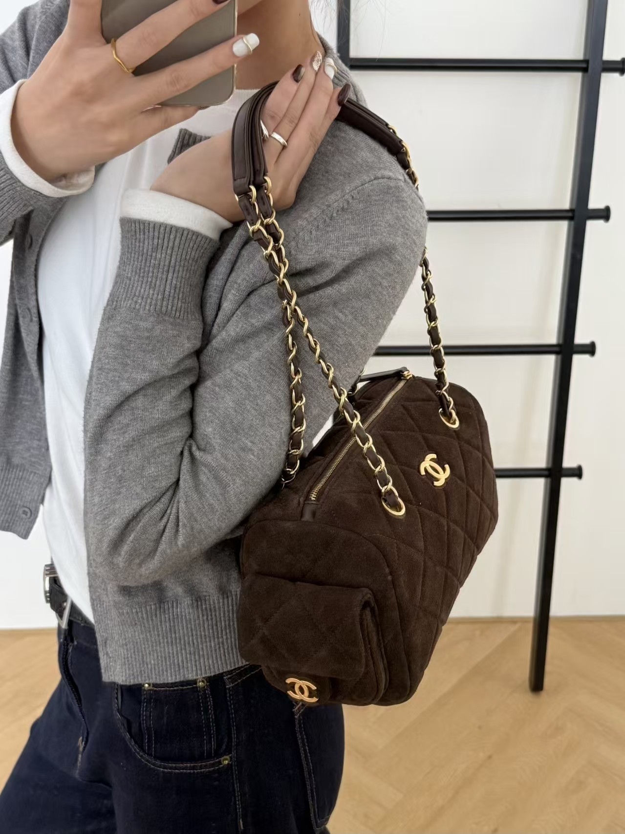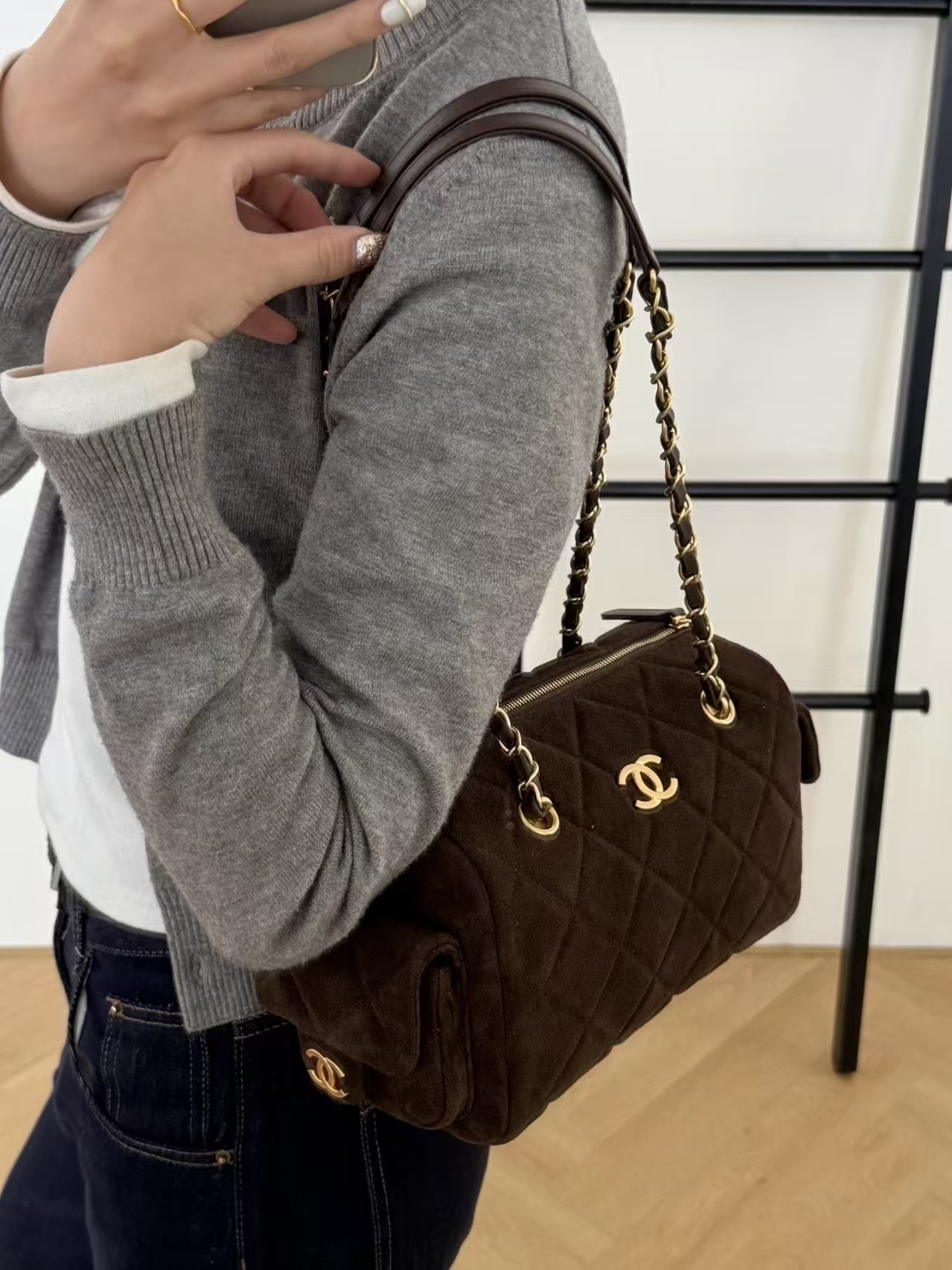 Chanel Small Bowling Bag Dark Brown Suede Antique Gold Hardware