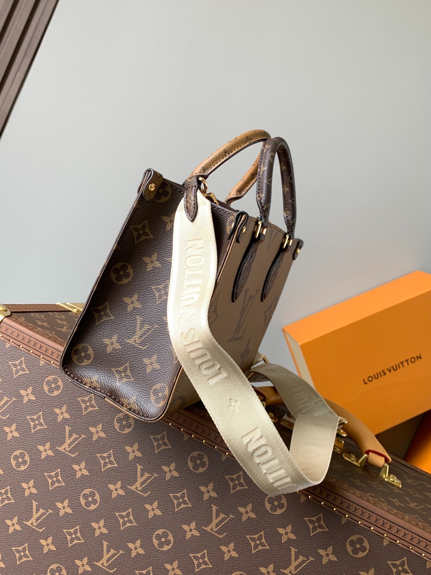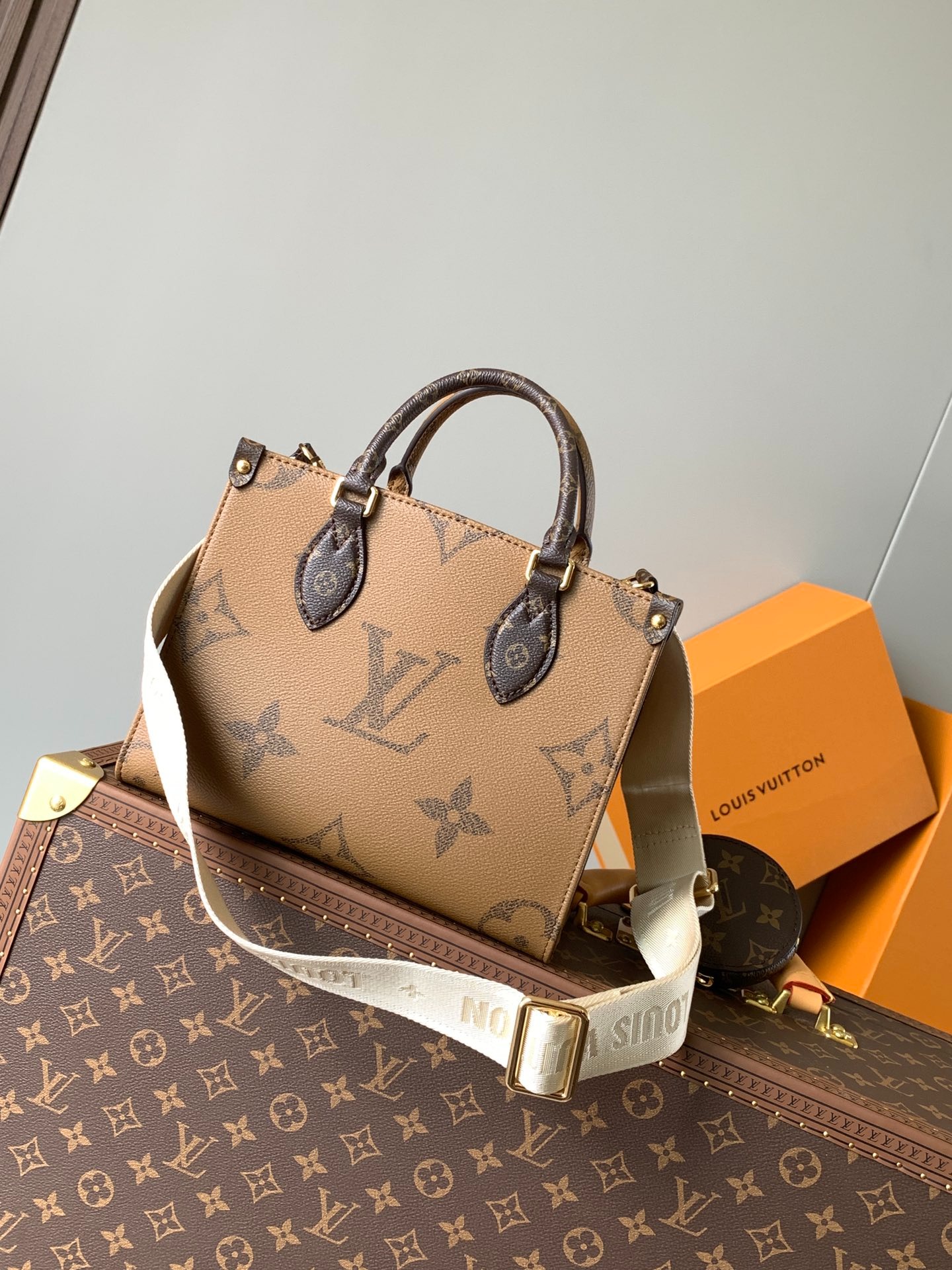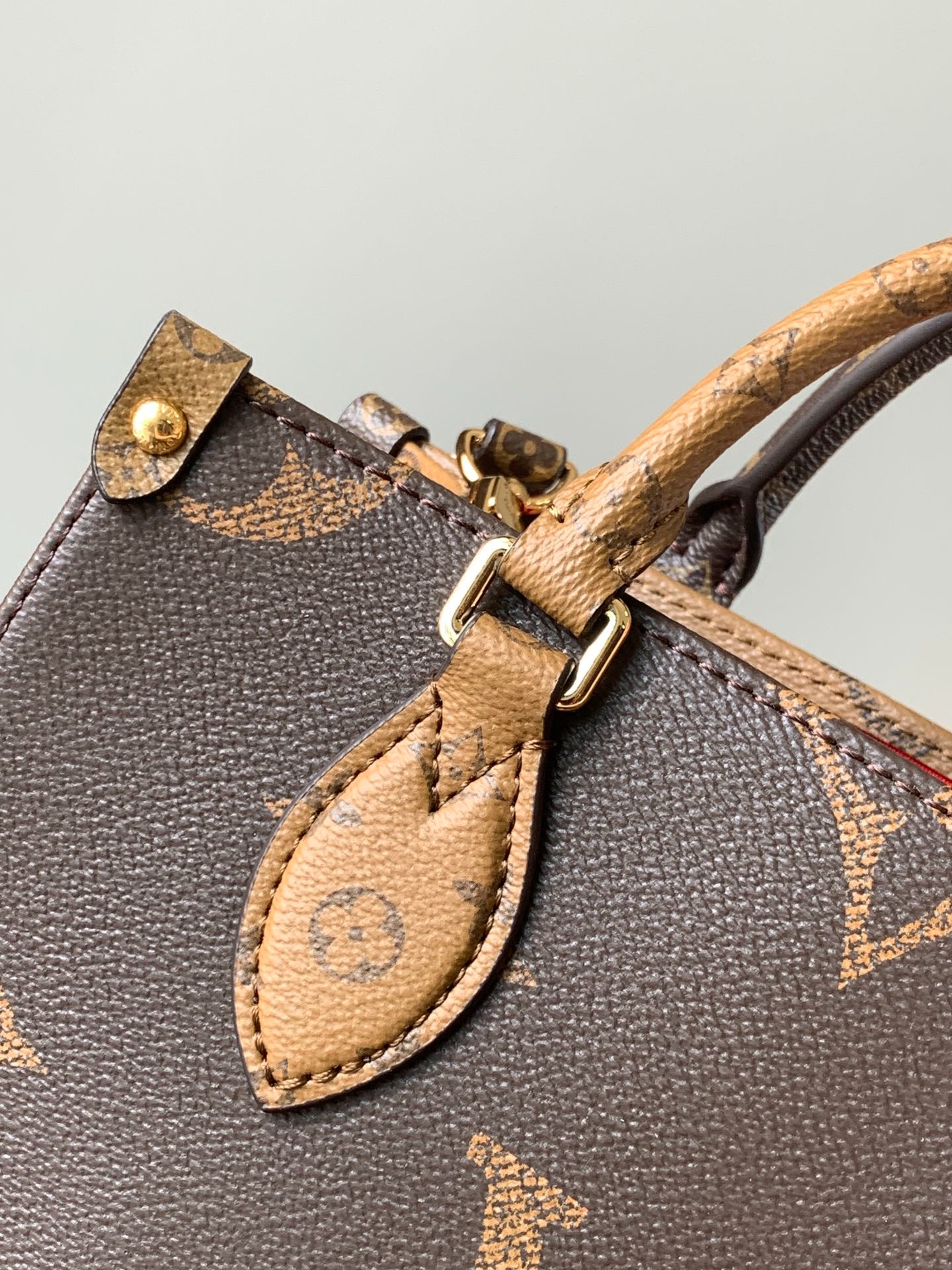 The M46373 OnTheGo small handbag combines Monogram and Monogram Reverse canvas, adorned with the Monogram Giant pattern. A Toron handle and a jacquard shoulder strap with the brand's logo create a visually contrasting look. A detachable coin purse is perfect for storing coins or small items. Combining stylish elegance with versatility, it's an ideal everyday companion.