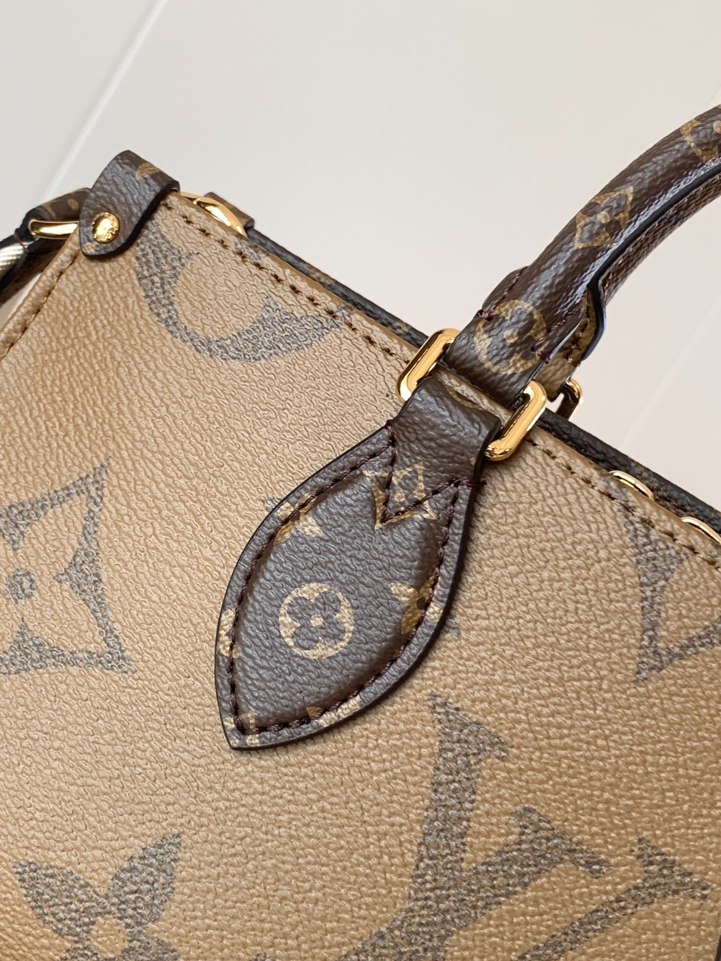 This OnTheGo tote bag reimagines the spacious silhouette of East West by combining Giant Monogram and Monogram Reverse canvas. A detachable round coin purse adds detail, while the Toron top handle and detachable wide shoulder strap offer multiple carrying options.