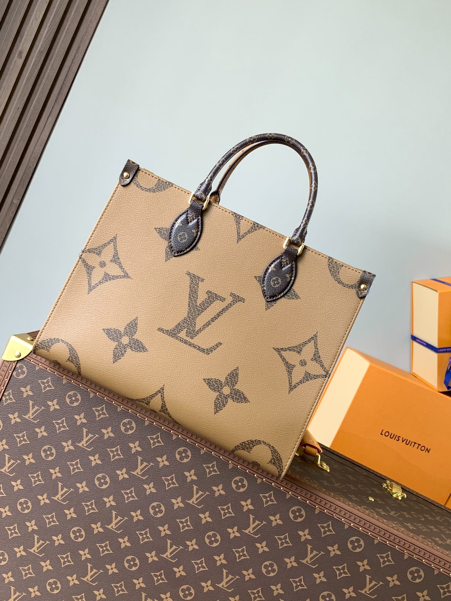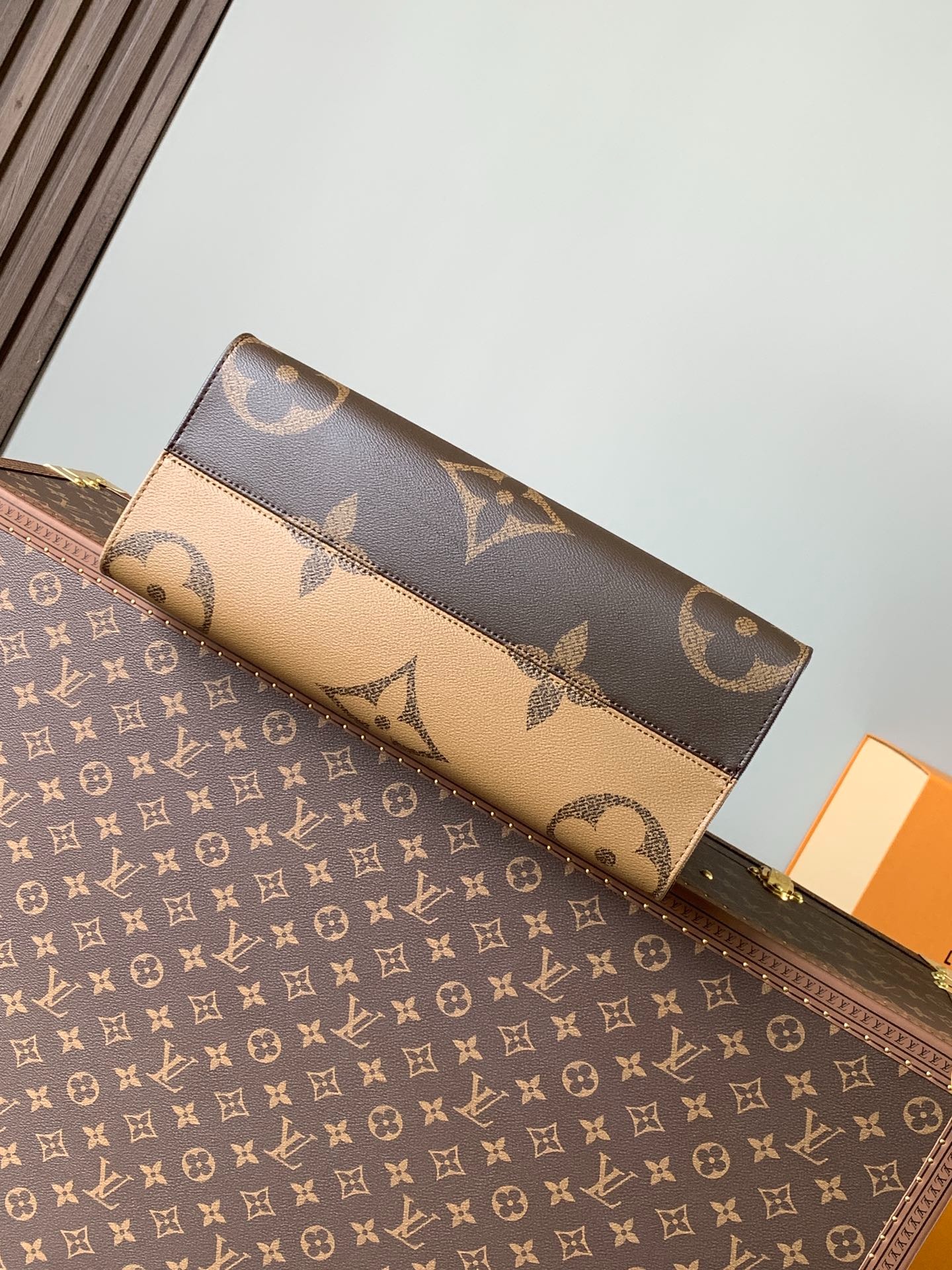 The M45321 Black Shoulder Strap Onthego Medium Handbag features classic Monogram canvas on one side and Monogram Reverse canvas on the other, offering a variety of stylish looks. The Toron handles and shoulder strap allow for multiple carrying options.