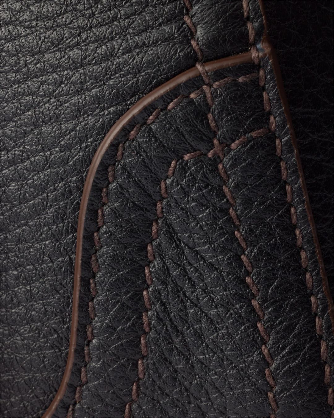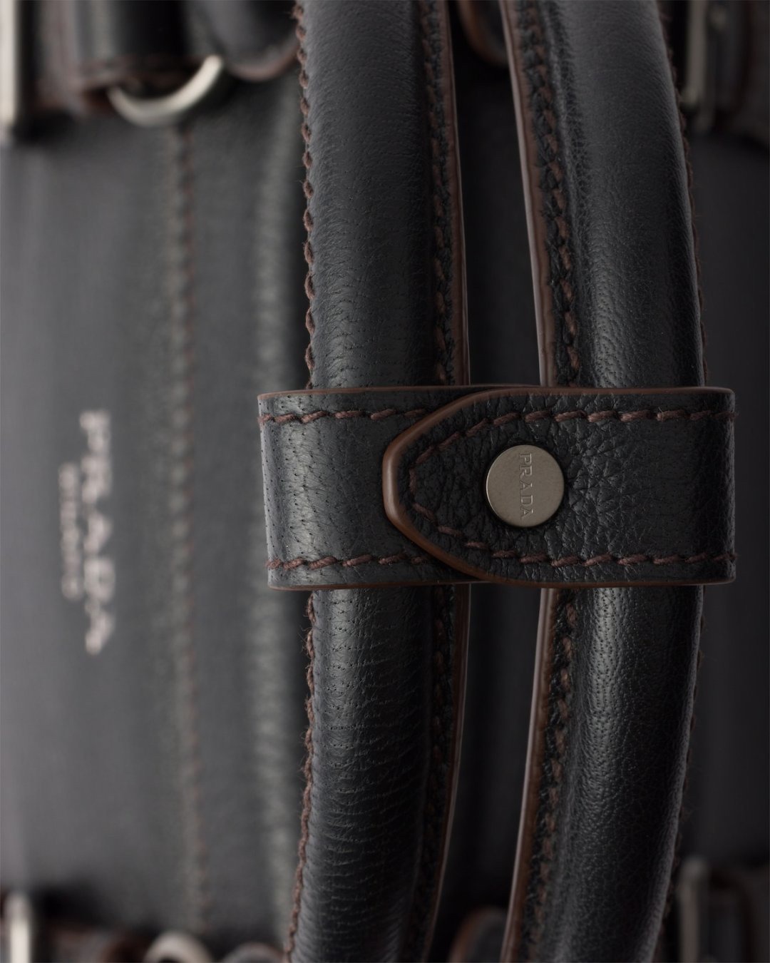 This bag returns to the roots of Prada's DNA with a design that evokes a travel theme. Its compact, versatile leather silhouette features a rich, irregular texture and a detachable shoulder strap for multiple wearing options. Reinforced corners are inspired by travel bags.